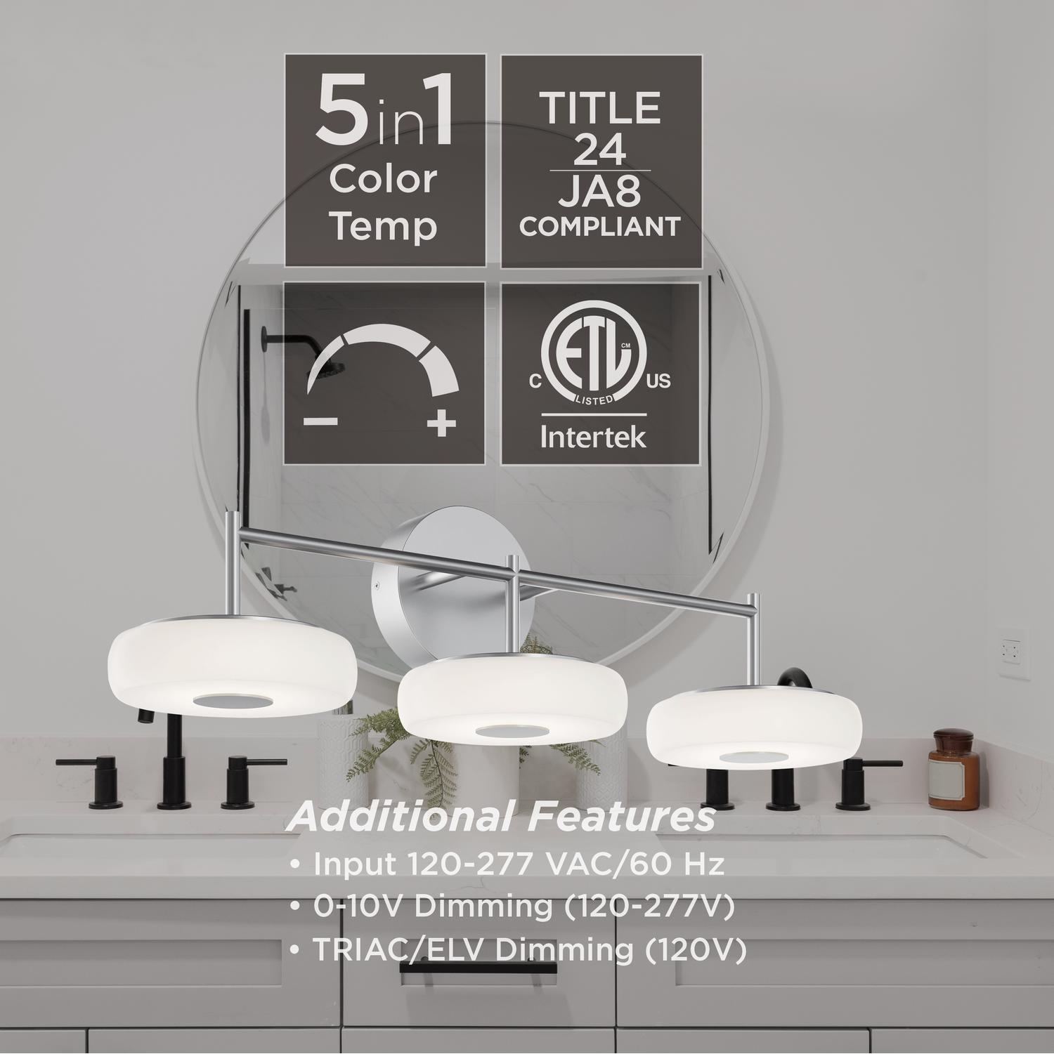 June vanity has a soft white acrylic diffuser that gives off soothing and ample light output. Metal construction and accent finial. Selectable 5CCT switch. Available in 3 or 4 light configurations and three finish options.