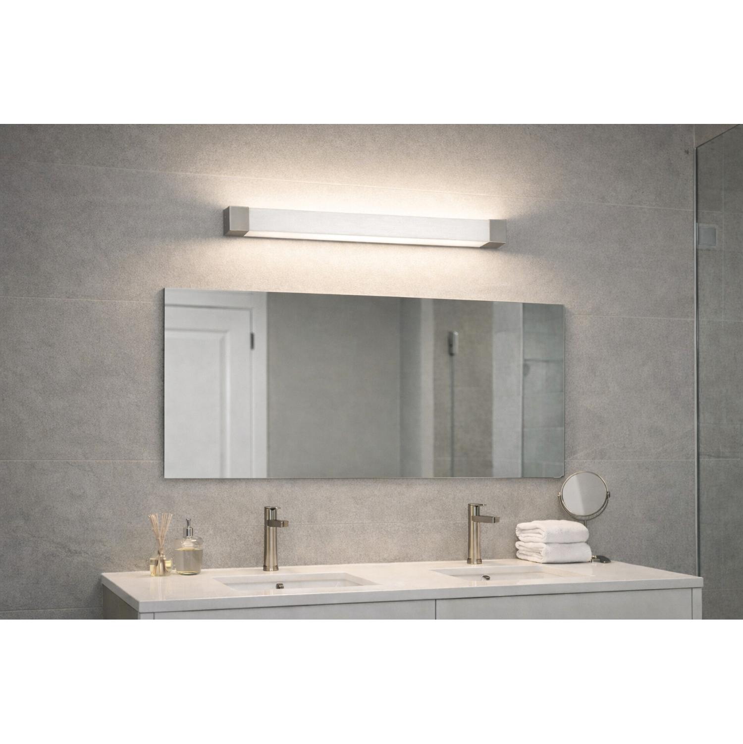 Simplistic curved design LED vanity features angled metal trim ends. Available in satin nickel finish and three lengths. Linen acrylic front diffuser.