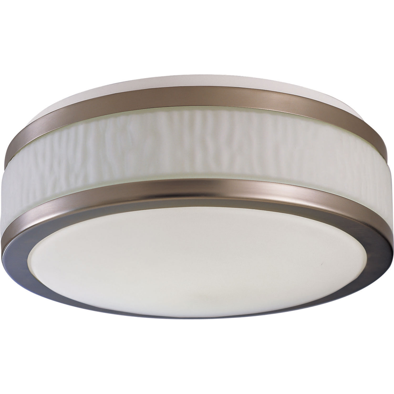 16' Diameter LED ceiling light features a white textured rain drop glass side diffuser. Metal accent trim band. Smooth white glass bottom diffuser.